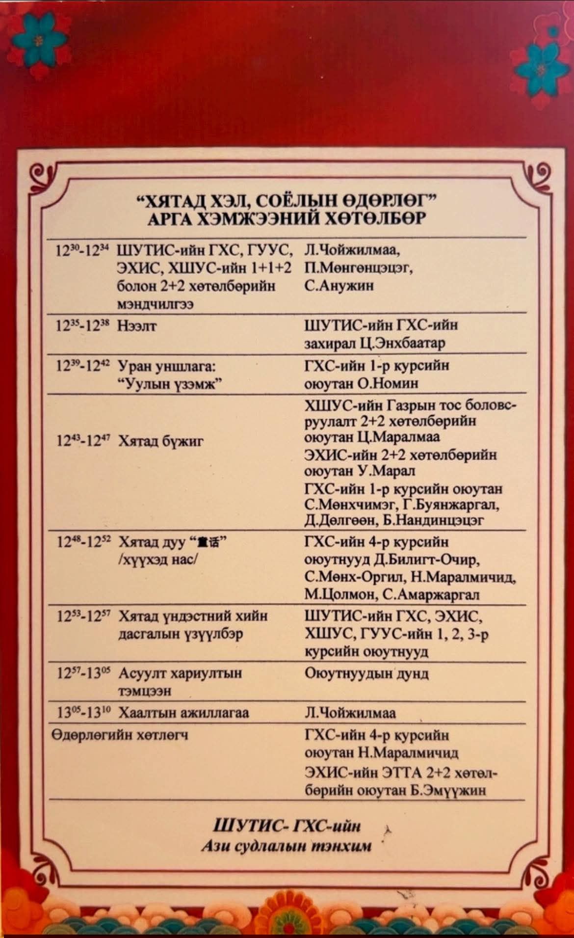 Хятад үндэстний хийн дасгал, дэвүүрт бүжгийг чадварлагаар хийж олны сонорыг мялаав. Эцэст нь үзэгчдийн дунд “Хятад орныг хэн сайн мэдэх вэ” асуулт хариултын тэмцээнийг зохион, бэлэг дурсгалын зүйл гардуулав. Тус арга хэмжээний хаалтын ёслолыг хийсний дараа арга хэмжээнд оролцсон багш, оюутнууд дурсгалын зураг авхуулав.