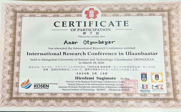 2026 оны 3 дугаар сарын 18-ны өдөр ШУТИС-ийн 2-р байрны 502 тоотод Олон улсын оюутны эрдэм шинжилгээний хурал амжилттай зохион байгуулагдлаа. Тус хурлын үйл ажиллагаанд Япон улсын Мияконожо Коосэн, МУ-ын ШУТИС, ШУТИС-Коосэн Технологийн Коллеж, Монгол Косэн, Шинэ Монгол Технологийн коллеж /Коосэн/-ийн оюутнууд оролцож 13 илтгэл хэлэлцүүлсэн.