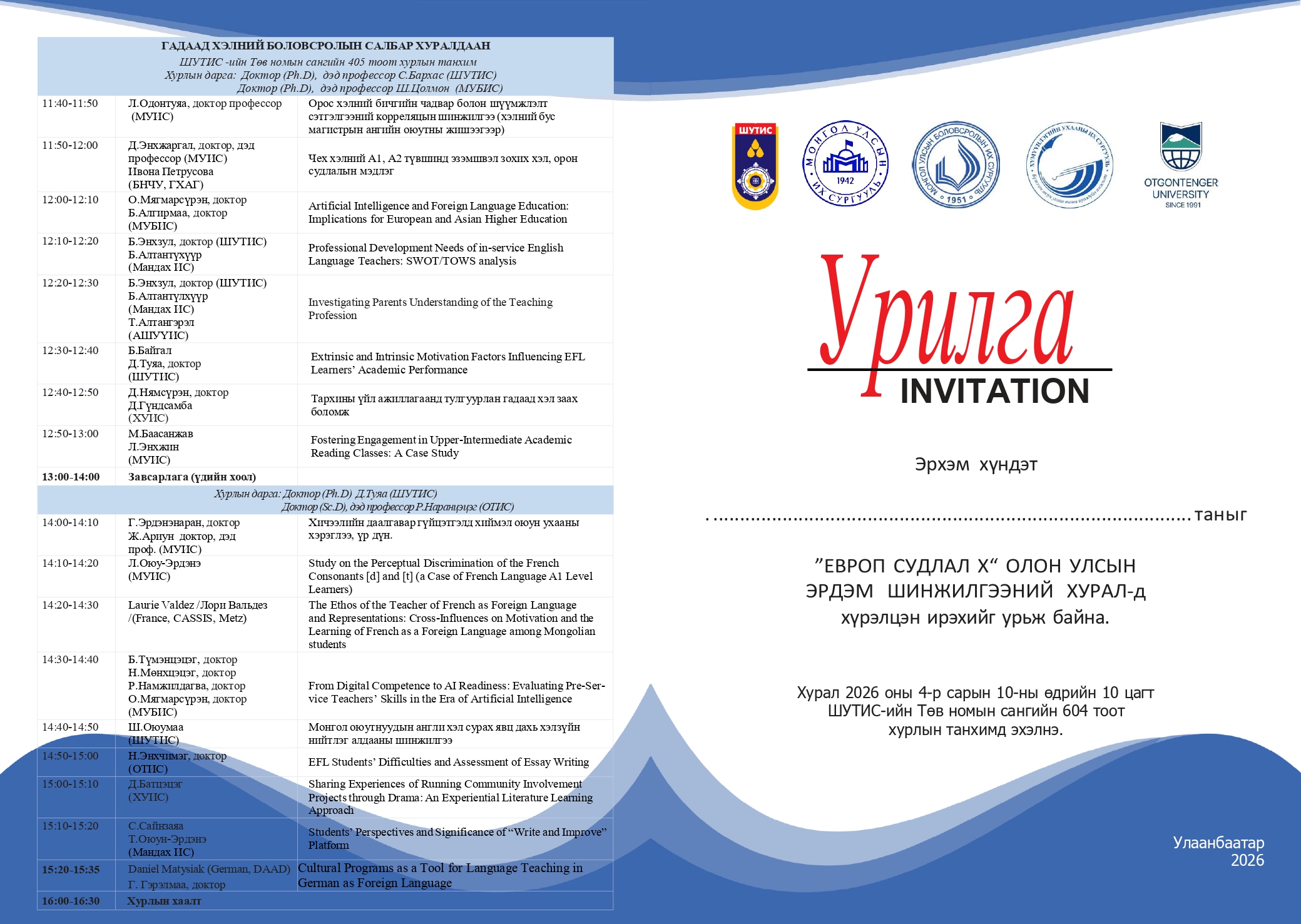 Хурал 2026 оны 4-р сарын 10-ны өдрийн 10 цагт ШУТИС-ийн Төв номын сангийн 604 тоот хурлын танхимд эхэлнэ.